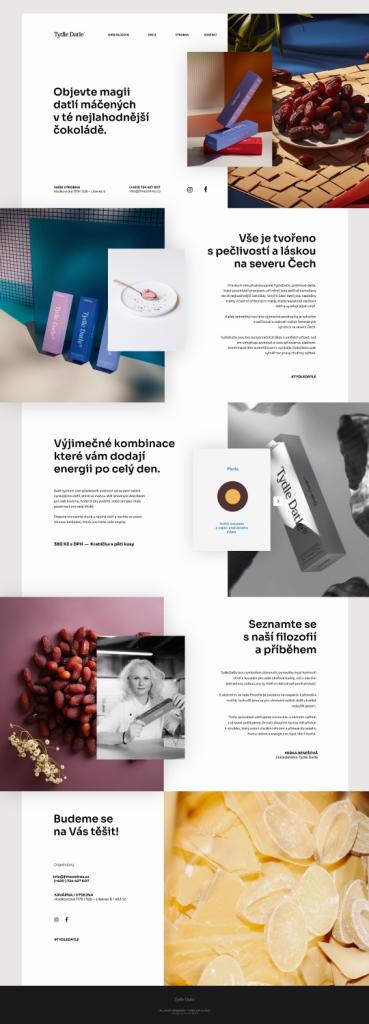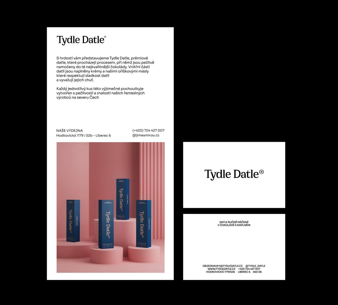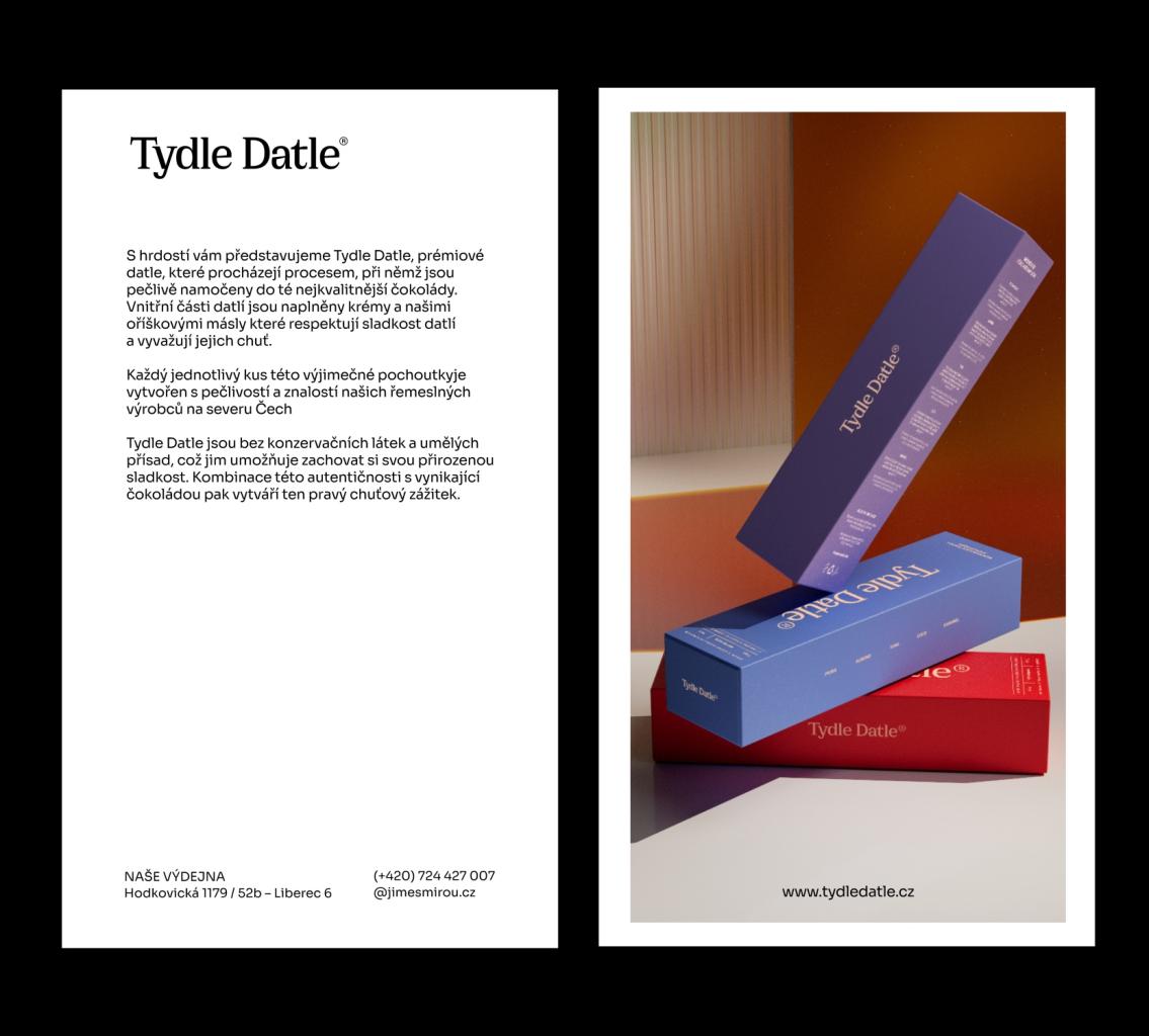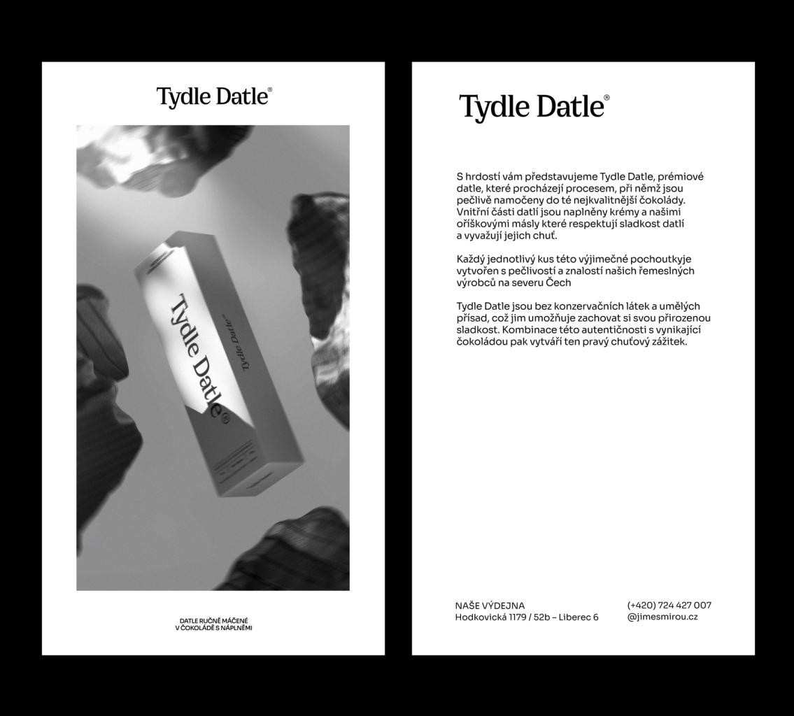 Pro Tydle Datle vznikla základní identita, kde hlavním výstupem projektu bylo – Logotyp, Krabička na datle, vizitky, web design, propagační materiály Design byl vytvořen pod vedením Vojtěcha Beneše a Benjaminu Buttlera Tydle Datle S hrdostí vám představujeme Tydle Datle, prémiové datle, které procházejí procesem, při němž jsou pečlivě namočeny do té nejkvalitnější čokolády. Vnitřní části datlí jsou naplněny krémy a našimi oříškovými másly které respektují sladkost datlí a vyvažují jejich chuť. Ecstasy Studio, 2024