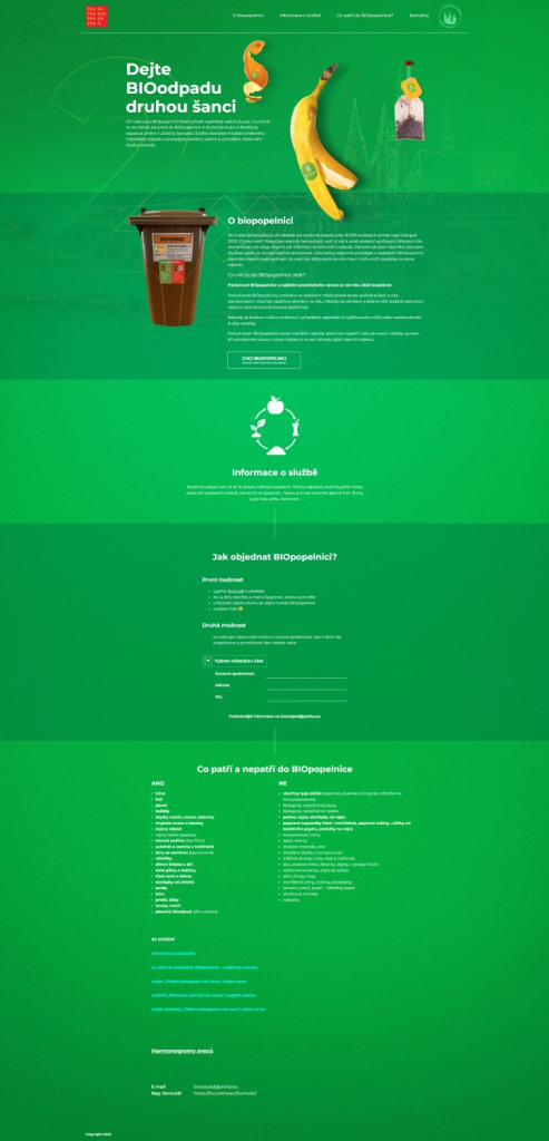 Na projektu jsme zajišťovali mimo jiné veškeré práce spojené s webdesignováním. Kampaň „Dejte druhou šanci bioodpadu“ měla za úkol informovat a edukovat pražskou veřejnost o svozu bioodpadu. Informovat o možnostech využití služeb (hnědých popelnic) a edukovat o následném využití bioodpadu v kompostárnách a bioplynných stanicích. Podíl bioodpadpu ve směsném odpadu bych kolem 20 %. Cílovou skupinou byly majitelé nemovitostí, ale i podnájemníci. Celá koncepce byla vymyšlena tak, aby byla aplikovatelná pro další agendy cirkulární ekonomiky (např. gastroodpad, reuse apod).