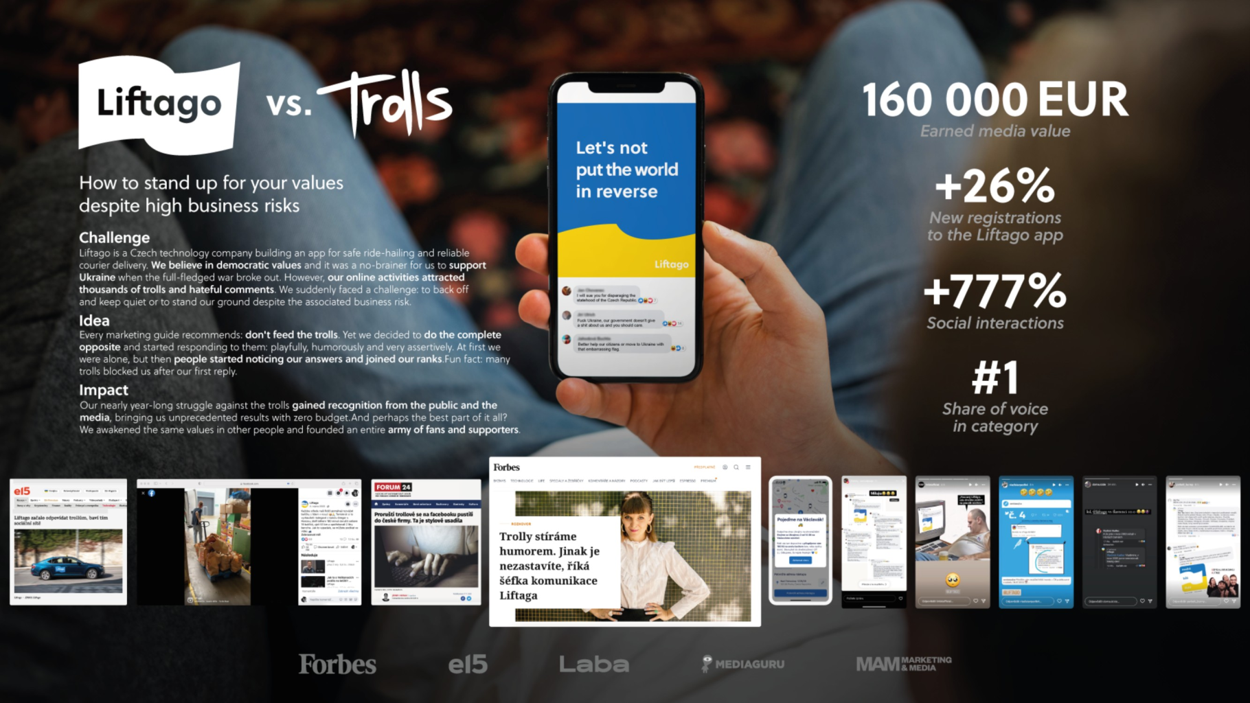 V roce 2023 jsme se společností Liftago obsadili první příčky ve 3 kategoriích v rámci ADC Czech Creative Awards. Podílel jsem se jako tvůrce videa a art director. Práce byla následně na Short listu v rámci evropského kola. Celá kampaň vzbudila dojem i v mnoha celorepublikových médiích. Práce zahrnovala videa, vizuály a mnoho dalších podpůrných prvků.