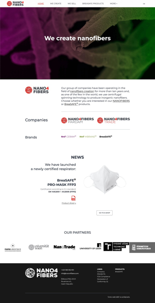Pro společnost NANO4FIBERS s.r.o. a jeji sestřiné společnosti jsme realizovali rebranding a nové weby Byl čas COVIDu a nano produkty zažily neuvěřitelnou horskou dráhu nahoru a dolů. A protože firem které umí vyrábět nano produkty nebylo mnoho, řešila se překotně osvěta, design, vzhled produktů a mnoho dalšího. Posuďte sami.