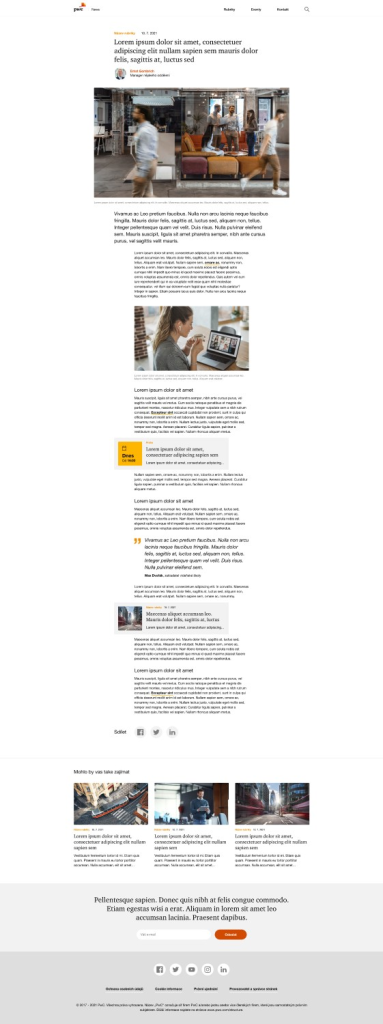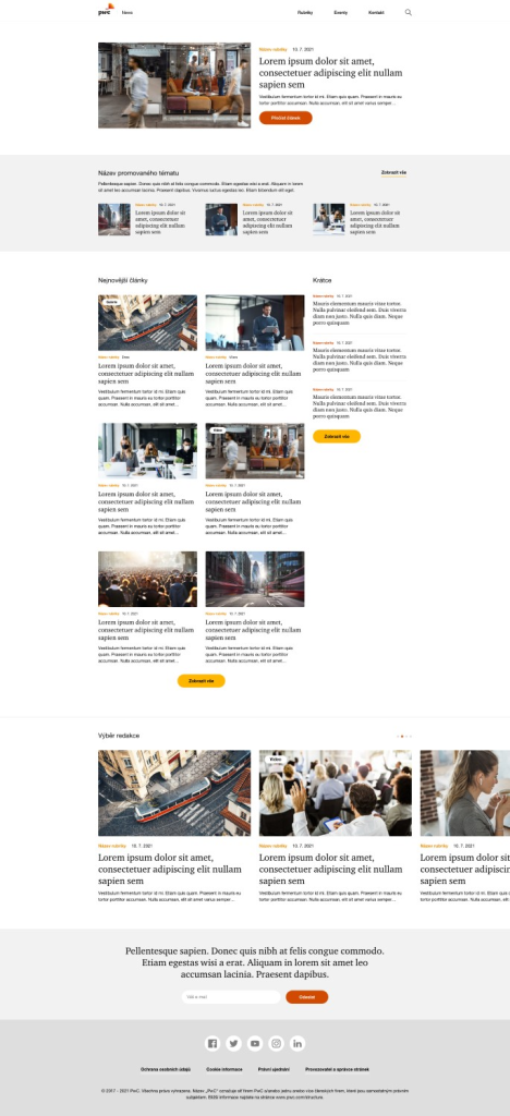 V rámci externí spolupráce s auditorskou společností PwC jsme navrhl moderní korporátní online magazín. Cílem bylo redefinovat starší verzi webu, to se však neobešlo bez důkladné srovnávací analýzy a následné změny některých prvků a struktury navigace. Projekt jsme s klientem dále rozvíjeli a rozšiřovali například o event sekci a další užitečné funkce a typy obsahu.