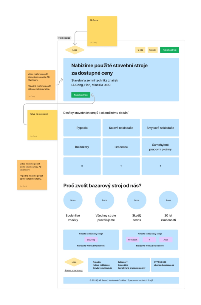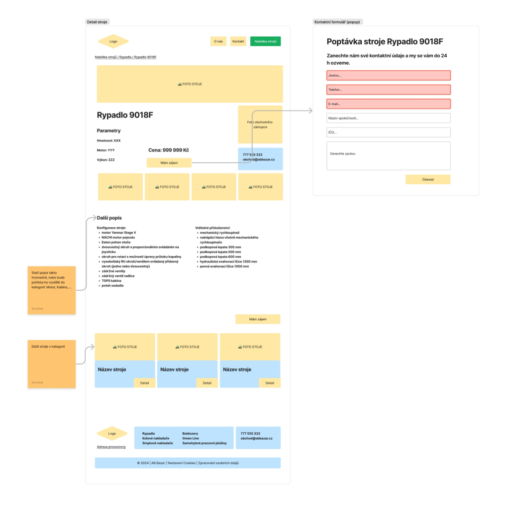 Jak prodat bagr přes internet? U projektu AB Použité stroje jsem navrhoval UX pro portál s použitou stavební technikou. Hlavním cílem bylo maximalizovat počet poptávek (leadů). Věděl jsem, že u takto drahého zboží rozhoduje důvěra a technický detail. Navrhl jsem proto čistou a přehlednou strukturu, která návštěvníka okamžitě navede k cíli. Klíčovým prvkem je intuitivní filtrace strojů a strategicky umístěné CTA prvky. Zjednodušil jsem proces kontaktování prodejce pomocí vyskakovacích (pop-up) formulářů přímo v detailu stroje, čímž se výrazně zkrátila cesta od zaujetí k poptávce.