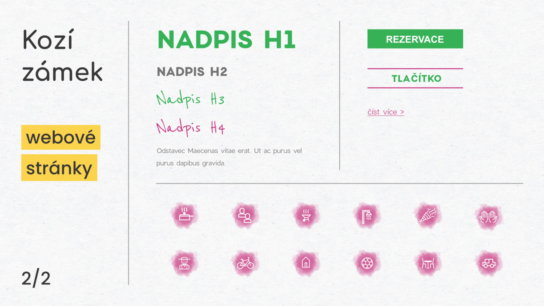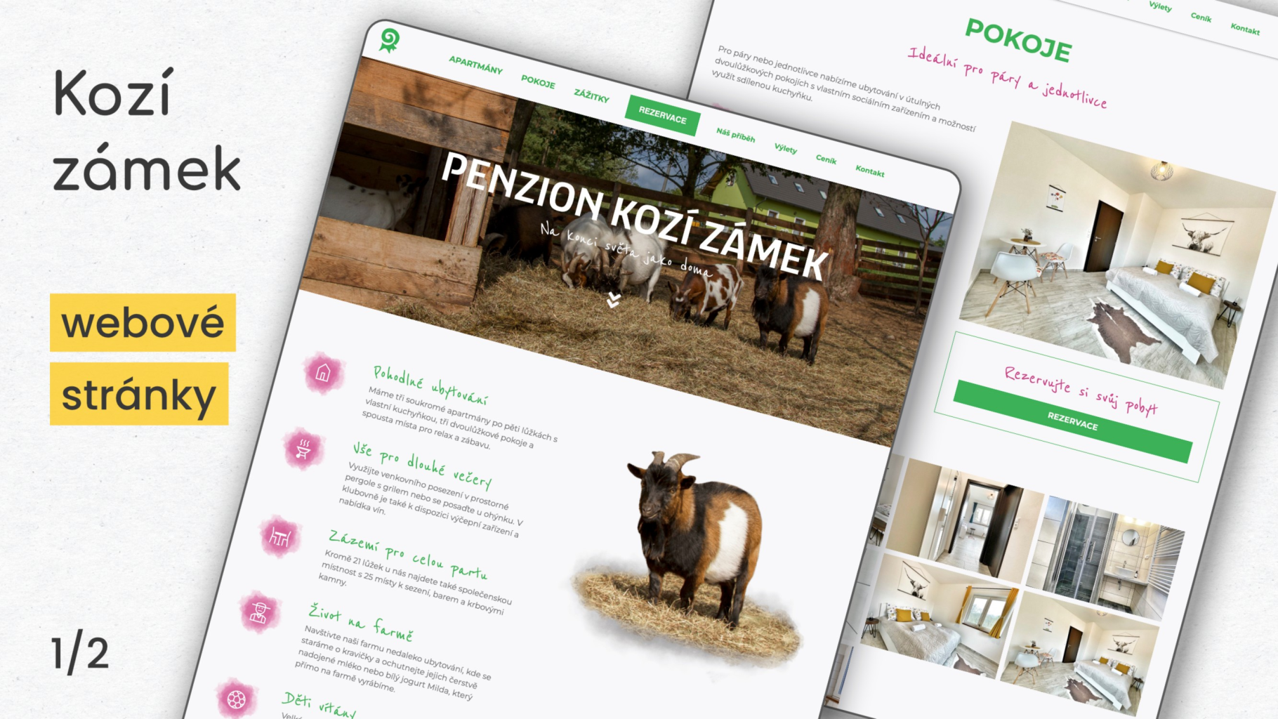 Nový web pro penzion Kozí zámek vznikal s několika cíli, které se podařilo úspěšně naplnit: - Přehledné zobrazení informací – Vytvořili jsme stránky, které mají čistý a strukturovaný layout. Návštěvníci se tak neztratí ani v poměrně velkém množství informací. - Napojení na rezervační systém – Rezervační systém třetí strany jsme vložili přímo do stránek, takže návštěvníci jsou schopni bez opuštění webu vyřídit rezervaci svého pobytu. - Originální ikony – Naším cílem bylo přinést webu penzionu Kozí zámek osobitý ráz. Proto jsme vytvořili sadu originálních ikon, které dodávají webu jedinečnost a atraktivitu. Malé detaily mohou udělat velký rozdíl! - Prostor pro fotky – Chápeme sílu vizuálního zážitku, proto jsme designovali stránky s důrazem na prostor pro krásné fotografie penzionu Kozí zámek. - Výrazné CTA (Call to Action) – Aby web plnil konverzní cíle, protkali jsme ho výraznými výzvami k akci, které návštěvník nemůže přehlédnout.
