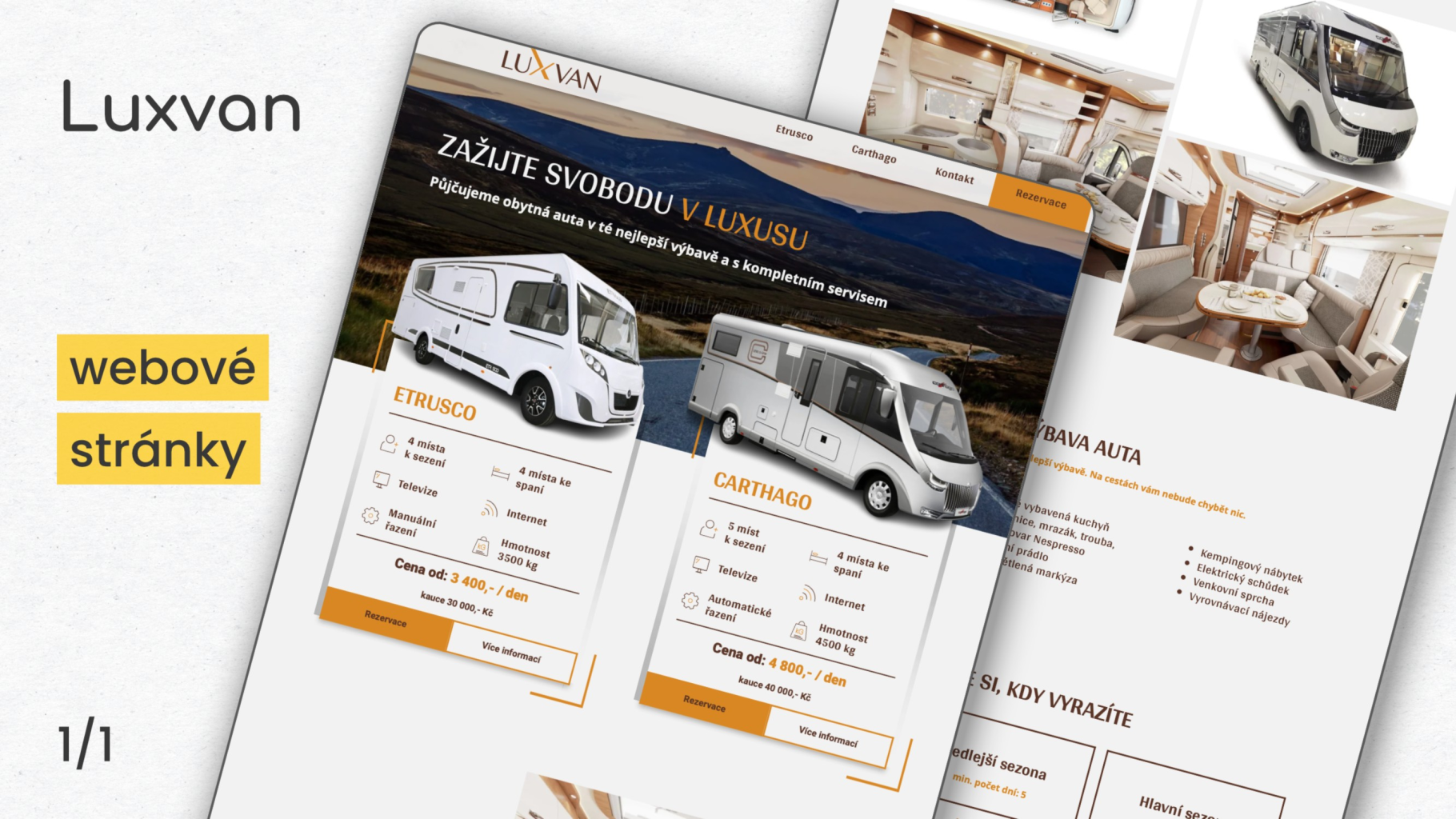 Při tvorbě webu Luxvan jsme začínali úplně od začátku. Jednalo se totiž o nově vznikající projekt, takže bylo potřeba nejprve ustálit vizuální styl a pak teprve navrhnout webdesign. V silné konkurenci na poli pronájmu obytných vozů se chce Luxvan odlišit nadstandardní kvalitou, kterou odráží i moderní styl webových stránek. Návštěvníci webu hned v úvodu získají všechny potřebné informace: typy pronajímaných vozů, vybavení a cenu pronájmu. CTA vede na jednoduchý rezervační formulář, který slouží jako hlavní konverzní nástroj. Důležitou součástí webu jsou přehledné podmínky pronájmu, které jsme zvýraznili sadou ikonek.