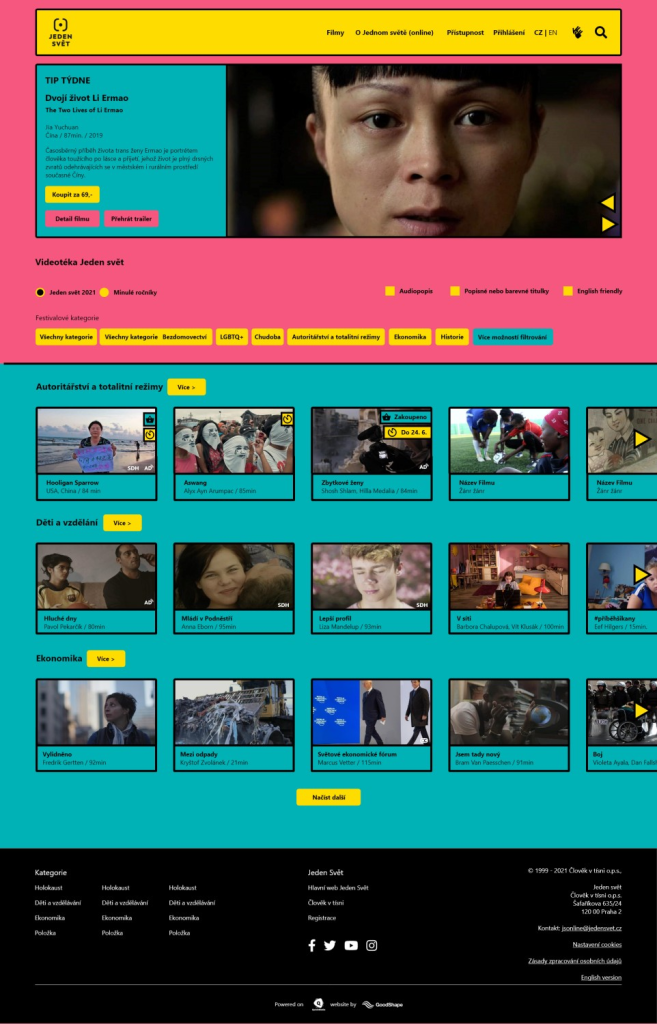 Realizace webu přední neziskové organizace Člověk v tísni, streamovací video platformy pro festival o lidských právech - Jeden svět. Filmy o lidských právech si díky platformě Jeden svět online můžete pustit odkudkoliv v České republice. Realizace zahrnovala konzultace, analýzy, UX, UI, grafický design, komplexní development a deployment na servery klienta.