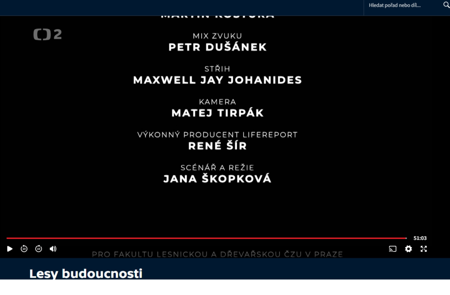 Dokument zjišťuje, jak lze využít nové poznatky lesnické vědy při tvorbě odolných a pestrých lesů... Lesy budoucnosti musí být schopné odolat měnícím se přírodním podmínkám, nedostatku vody i přívalovým dešťům, extrémnímu suchu i různým škůdcům. Zároveň musí poskytovat radost a prostor pro odpočinek na čerstvém vzduchu, ale i produkovat v dostatečném objemu tolik potřebný přírodní obnovitelný materiál pro náš každodenní život. Dřevo totiž je a bude strategická ekologická surovina, a proto je důležité se o lesy starat. Odborníci z Fakulty lesnické a dřevařské České zemědělské univerzity v Praze řeší problém, jak by měly vypadat lesy budoucnosti, které musí být schopné odolat měnícím se přírodním podmínkám, nedostatku vody i přívalovým dešťům, extrémnímu suchu i různým škůdcům. Zároveň musí poskytovat radost a prostor pro odpočinek na čerstvém vzduchu, ale i produkovat v dostatečném objemu tolik potřebný přírodní obnovitelný materiál pro náš každodenní život. Dřevo totiž je a bude strategická ekologická surovina, a proto je důležité se o lesy starat. Dokument ukazuje, jak by měly vypadat lesy budoucnosti. Zjistíme, jak lze využít hydrogel v boji se suchem při obnově lesa, jak se podílí čeští vědci na rozluštění genomu kůrovce. Jak se používají chemický nos k identifikaci napadeného kůrovcového stromu, moderní GPS telemetrie ke sledování zvěře, drony ke zjištění zásoby dřeva v lese, poznatky o lesních požárech k jejich prevenci, harvestory šetrným způsobem k bezpečné a efektivní těžbě dříví, moderní pily se skenovacími systémy ke zpracování regionálně vytěženého dříví a unikátní ekologický přírodní obnovitelný materiál – dřevo – k výrobě inovativních materiálů i ke zdravému bydlení ve dřevostavbách. (Česká televize)