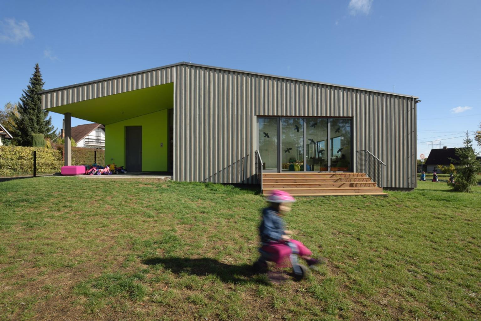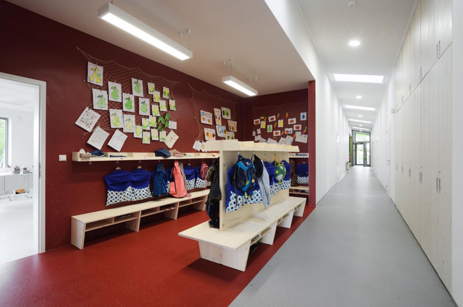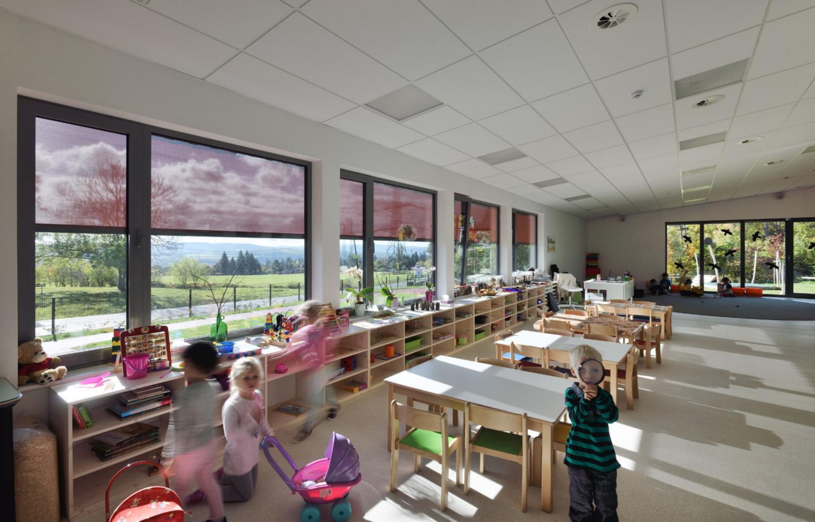 Budova mateřské školy je navržena jako trojtakt orientovaný podélně s ulicí Březovská. Prostředním traktem vede chodba, ve které jsou situovány šatny, a je současně to hlavní komunikační prostor budovy. Chodba je přístupná z obou stran objektu, kde je navrženo zádveří. Na severní straně chodby je situováno technické a provozní zázemí objektu (šatny, prádelna, kancelář, přípravna a výdejna jídel a technická místnost, WC přístupné z exteriéru). Na protilehlé straně chodby jsou umístěny dvě učebny, sociální zázemí pro děti, pohotovostní WC pro učitelky a místnosti pro učební pomůcky. Hlavní vstup do budovy je navržen po zpevněné ploše ze severovýchodní strany do prostředního traktu budovy. Z ulice Březovská jsou navrženy tři vstupy na pozemek. Vjezd do zahrady sloužící údržbě, druhý bude využíván pro zásobování výdejny jídel a třetí vstup bude sloužit pro přístup do výdejny jídel do jídlonosičů. Každá z učeben má navržen samostatný výstup na zahradu sloužící jako druhá úniková cesta. Střecha je přístupná střešním průlezem s žebříkem z prostoru šatny zaměstnanců.