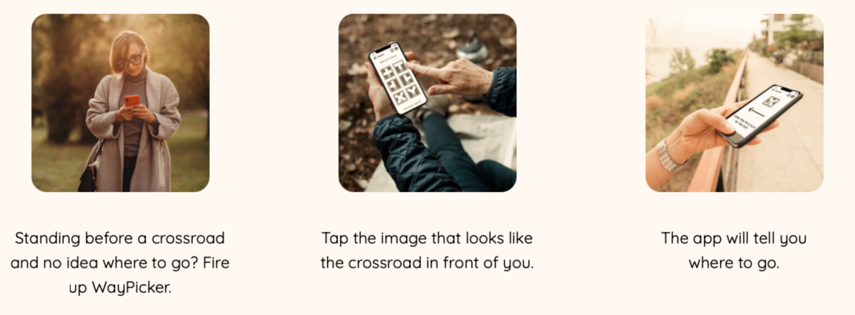Webové stránky pro aplikaci Waypicker. Unikátní bezmapová navigační aplikace. Pokud rádi prozkoumáváte nová města nebo známá města novým způsobem, tato aplikace vám pomůže prožít unikátní zážitek. Na každé křižovatce si můžete vybrat aktuální křižovatku a náhodně vyberete směr další cesty. Aplikace je dostupná pro iOS a umožní vám se lehce ztratit v jakémkoli prostředí.